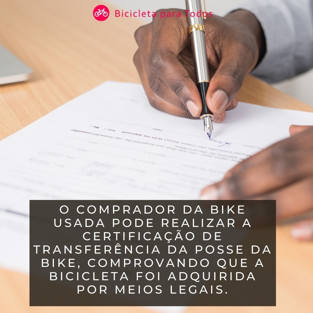 Com isso, o comprador de uma bike usada pode realizar uma certificação de transferência da posse da bike, comprovando, assim, que a sua bicicleta foi adquirida por meios legais e, agora, te pertence.