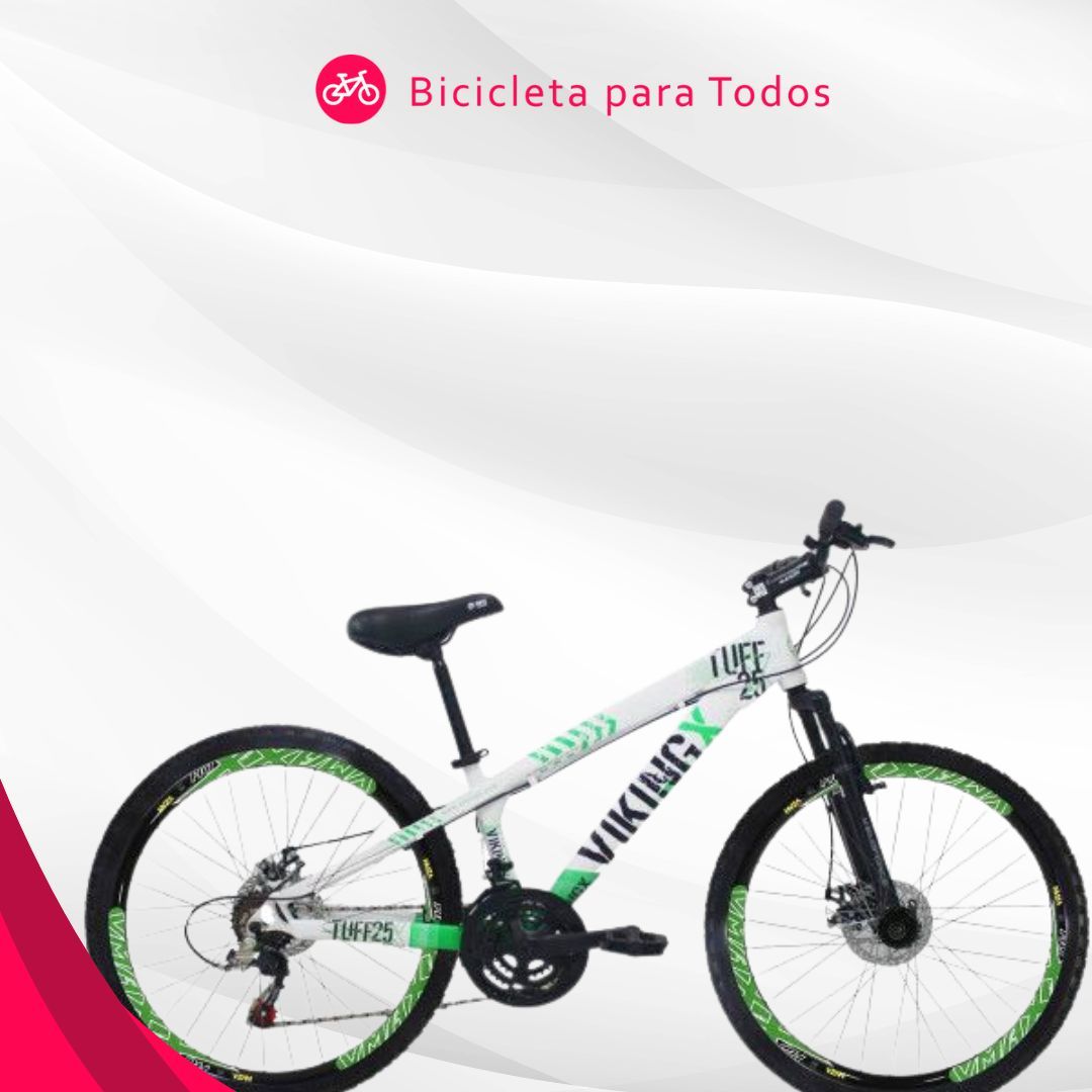 Ela é da marca Vikingx do modelo Tuff25 Freeride, de cor branca e verde e é uma das maiores bicicletas da lista, pois possui aro 26.