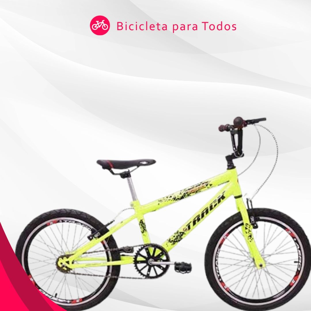 O veículo da marca Track Bikes de modelo Noxx BMX possui aro 20, está na amarelo neon e possui o tamanho do quadro em 11 polegadas.
