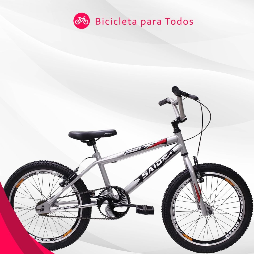 A bicicleta da marca Saidx do modelo Cross BMX possui uma mesa de alumínio de quatro parafusos, freios V-Brake Nylon, manetes de nylon, pneus aro 20, catraca com roda livre de vinte dentes, os aros são aero reforçados em alumínio, cubo de aço carbono e uma pedivela de monobloco de aço.